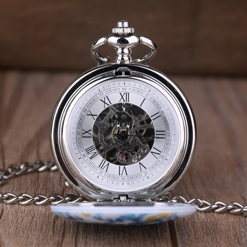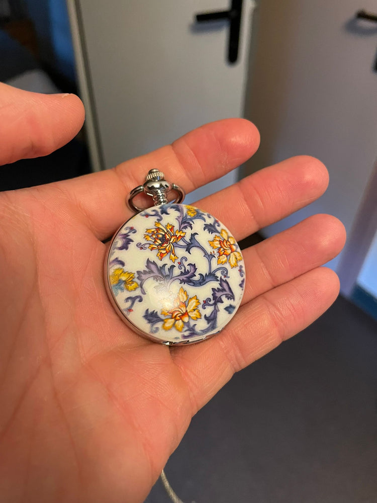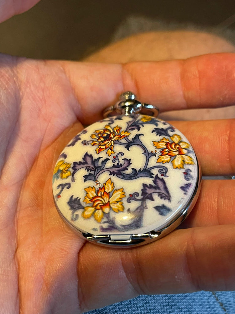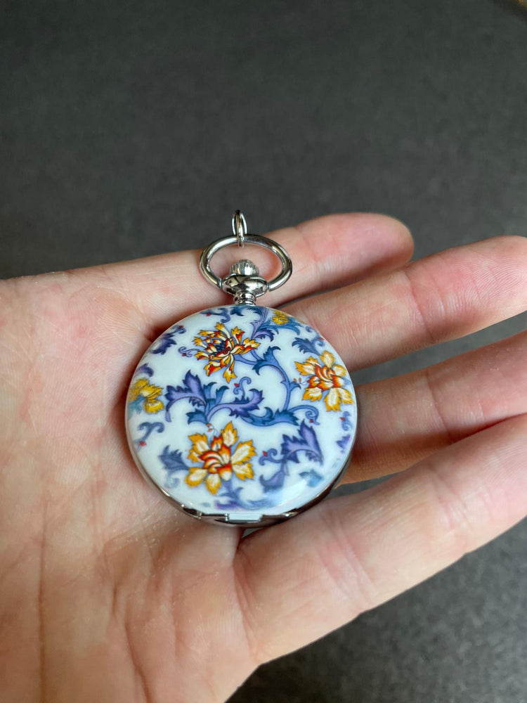 Redécouvrez le charme d'antan avec cette magnifique montre à gousset au design raffiné. Son couvercle en céramique est orné de délicats motifs floraux où des volutes d'un bleu profond mettent en valeur des fleurs aux teintes orangées et jaunes. Cet accessoire intemporel est l'alliance parfaite entre l'horlogerie classique et l'élégance d'un bijou d'inspiration asiatique. Idéale pour parfaire une tenue habillée ou pour offrir un cadeau unique et mémorable.